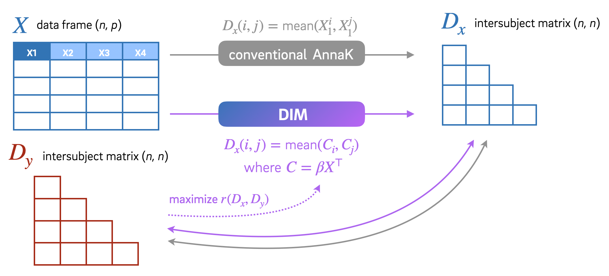 To overcome these challenges, we introduce DIM (Differentiable Idiosyncrasy Modeling), a Python package facilitating flexible IS-RSA pipelines (Lee & Jolly, in prep). DIM supports traditional hypothesis testing (e.g., Anna Karenina, Nearest Neighbor) while enabling “hypothesis generation”: it accepts multivariate inputs and optimizes weights to maximize correlation with the target distance matrix. This framework allows for systematic comparisons between hypothesis-driven and data-driven models and provides a streamlined workflow for evaluating replicability on unseen data.