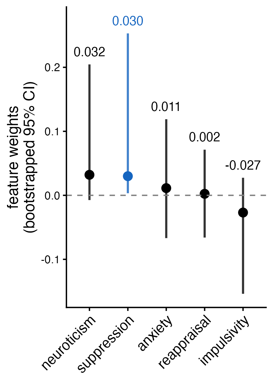 Despite its utility, current IS-RSA applications face two major theoretical and methodological limitations. First is the univariate problem. Models like Anna Karenina typically rely on a single predictor variable. While effective for specific hypothesis testing, this approach fails to determine if the selected variable is the unique or most robust construct explaining the target representation. For instance, Kim & Kim (2022) noted potential confounding by sex, and the literature suggests other constructs such as emotion regulation strategies (d’Arbeloff et al., 2018; Eden et al., 2015), trait neuroticism (Bjornebekk et al., 2013; Ueda et al., 2018), and trait impulsivity (Peper et al., 2013) also relate to vPFC-amygdala structure. Furthermore, univariate behavior-brain associations often yield small effect sizes and low statistical power, hindering replicability (Genon et al., 2022; Kharabian et al., 2019; Marek et al., 2022). Thus, a data-driven approach is required to identify a “psychological profile” that integrates various variables to maximize the correlation with neural structural variability.